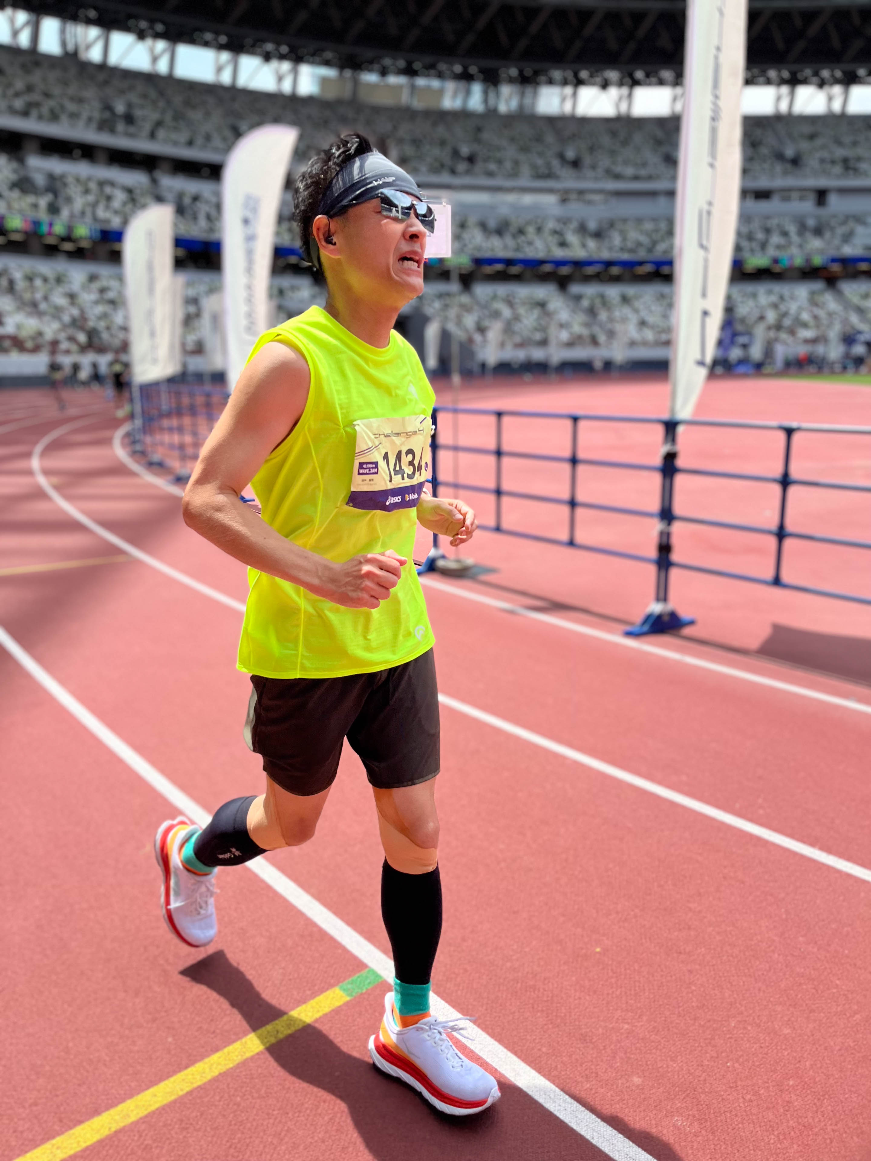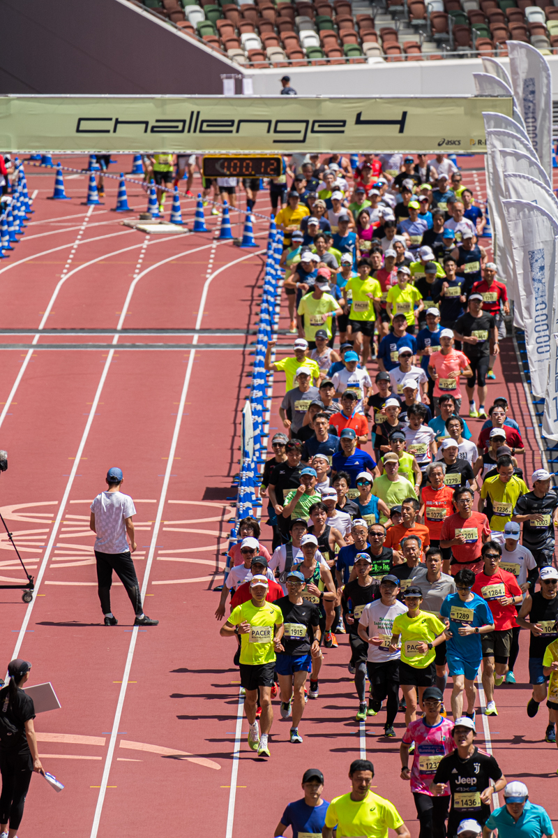 大会当日、会場は国立競技場内外周に設定された1周1.4キロの周回コース。黄色いシャツのペースメーカーが、ちょうどサブ4のペースに3人、それより1km当たり10秒速いペースに3人、10秒遅いペースに3人入って引っ張ってくれる。この人たちに着いて走ればサブ4達成だ。