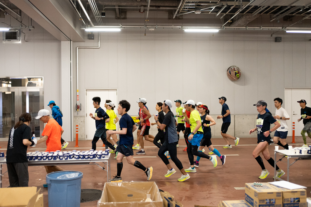 30kmを目前に、膝の痛みが悪化するのと並行して、涼しい室内の外周路と暑い屋外のトラックを毎周行き来する負担が身体に現れ始めた。若干腹が痛く、それまで150程度だった心拍数も170を超えるほどに上がってきた。同じ調子で走っているはずのペーサーに着いて走るのが急に辛くなっていた。