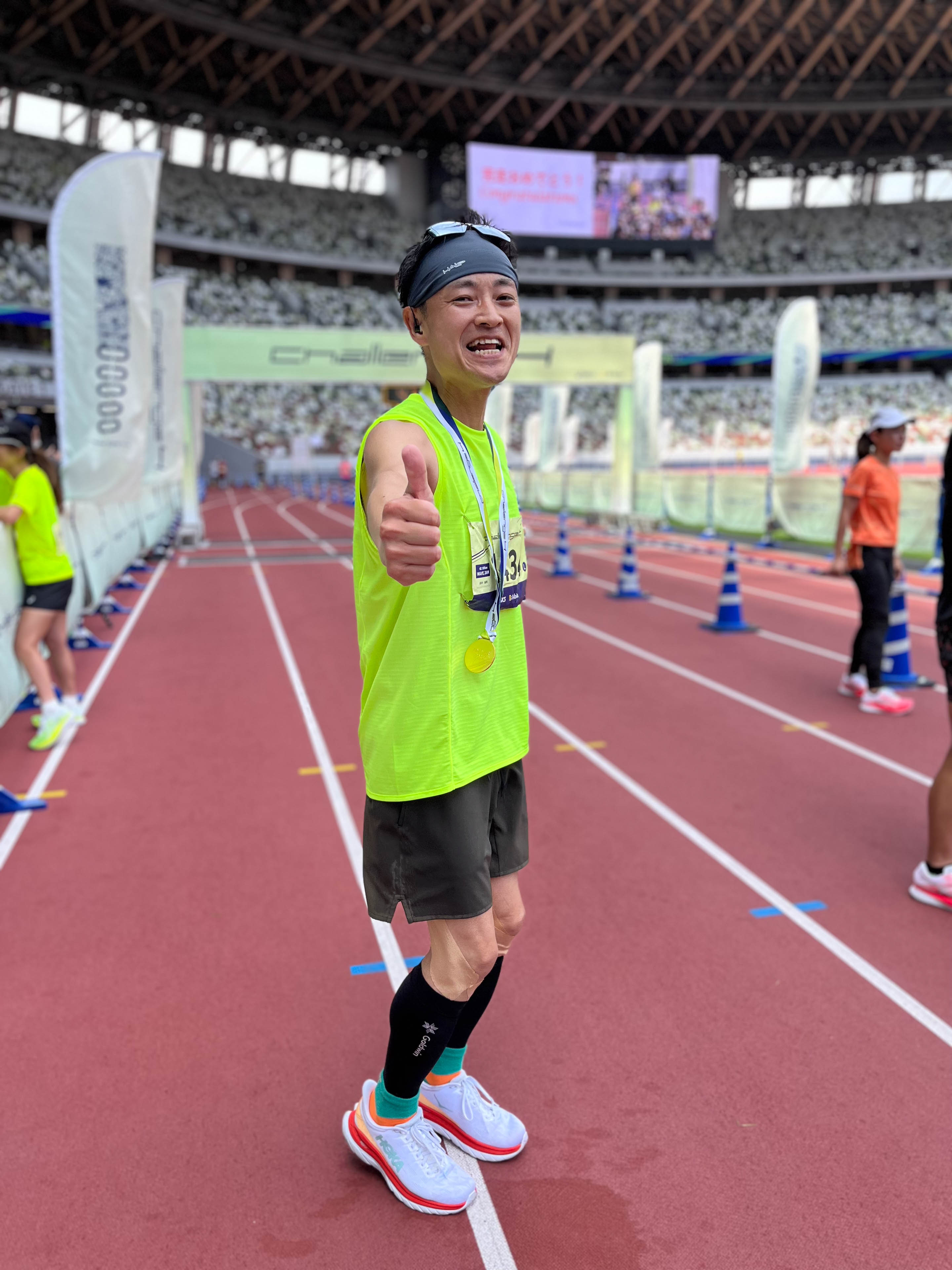 ゴール後、完走メダルを首にかけられても心は晴れない。膝の痛みや疲労感以上に、目標達成できなかったことへの悔しさが大きかった。