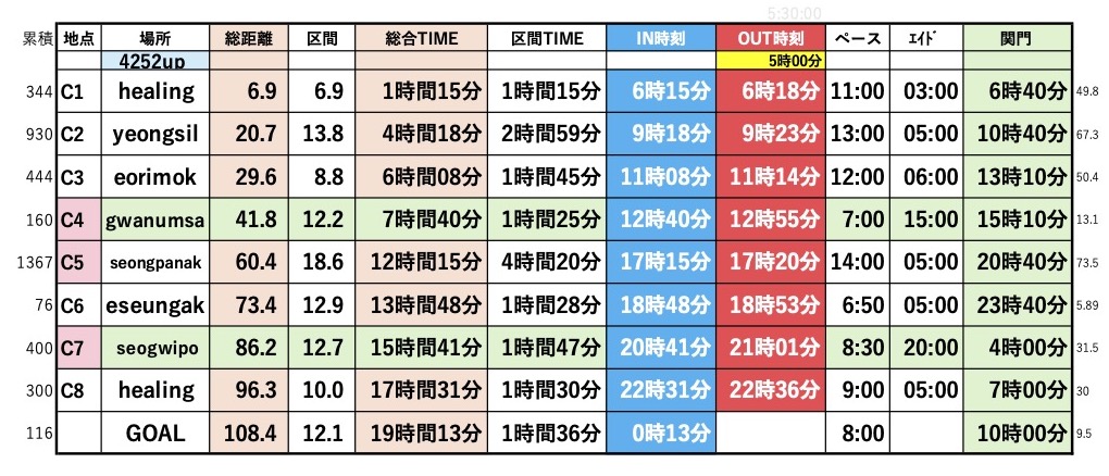 私にとって海外レースは初めての挑戦。渡航や現地手配はトレイルラン専門ツアー「ルクタスアドベンチャーズ」に委ねた。ツアーに参加することで不安要素は減らせたが、現地の大会情報は限られ、エイドで提供される飲食物の細かな内容も不明だった。大会前日のEXPO(受付会場)では日本のように補給食やトレラン用品の販売がなく、現地調達は困難なことは事前に知っていたため、必要なものは全て日本から持参した。自分の過去の成績と、公式情報を基に目標タイムを約19時間(予備プラン21時間)と設定し、区間ごとの距離と累積標高から詳細なペース表を作成して携行した。