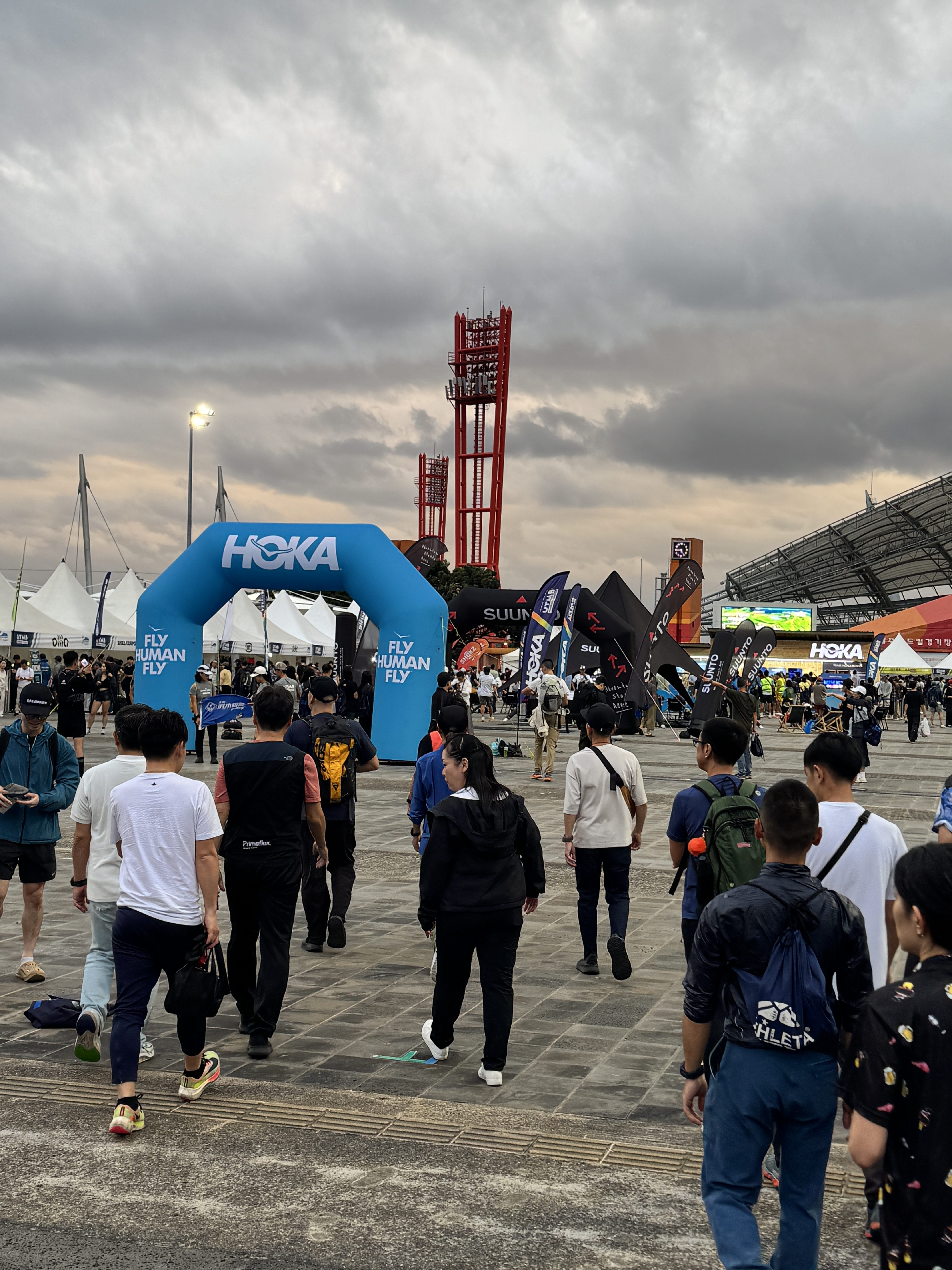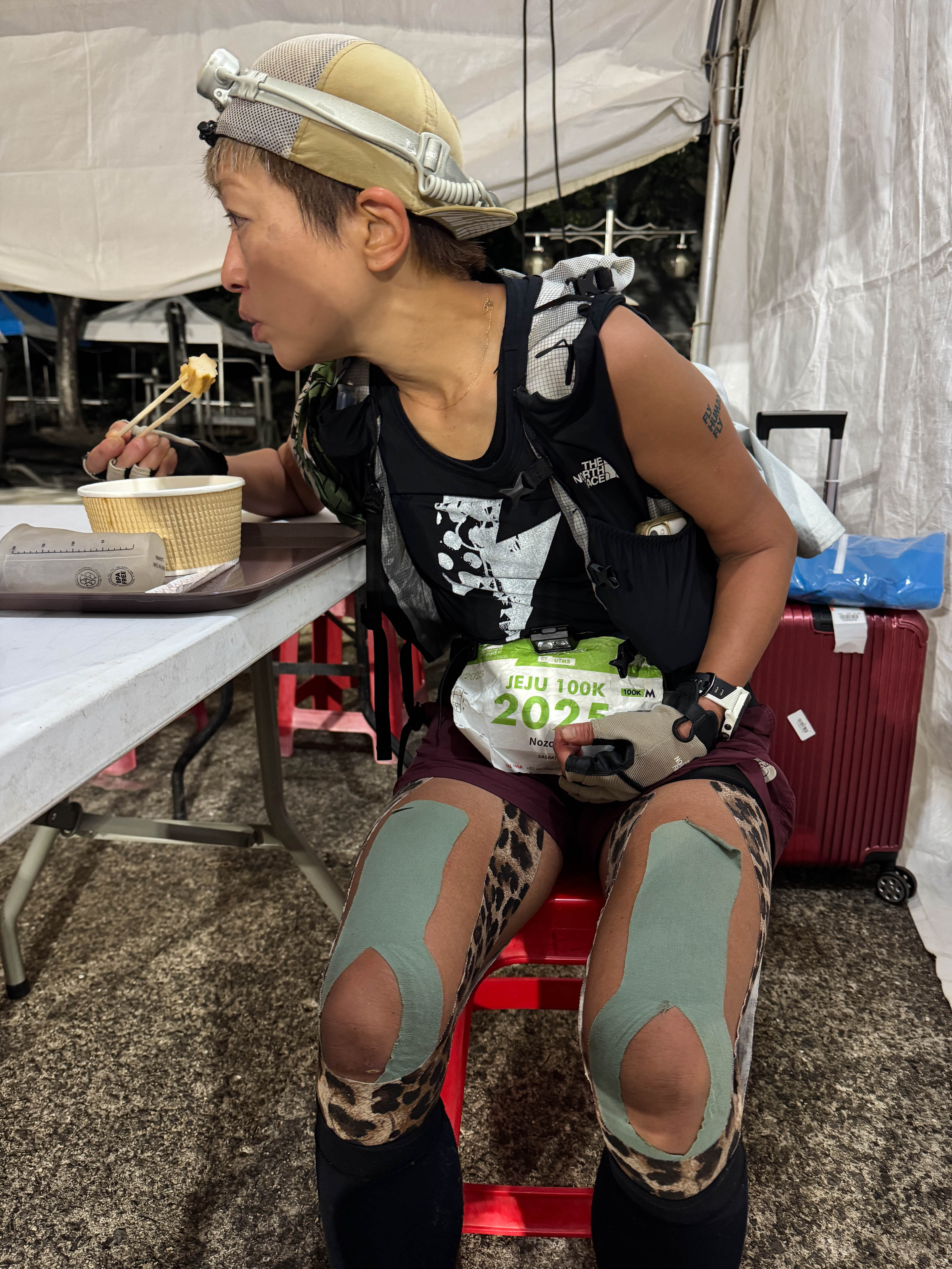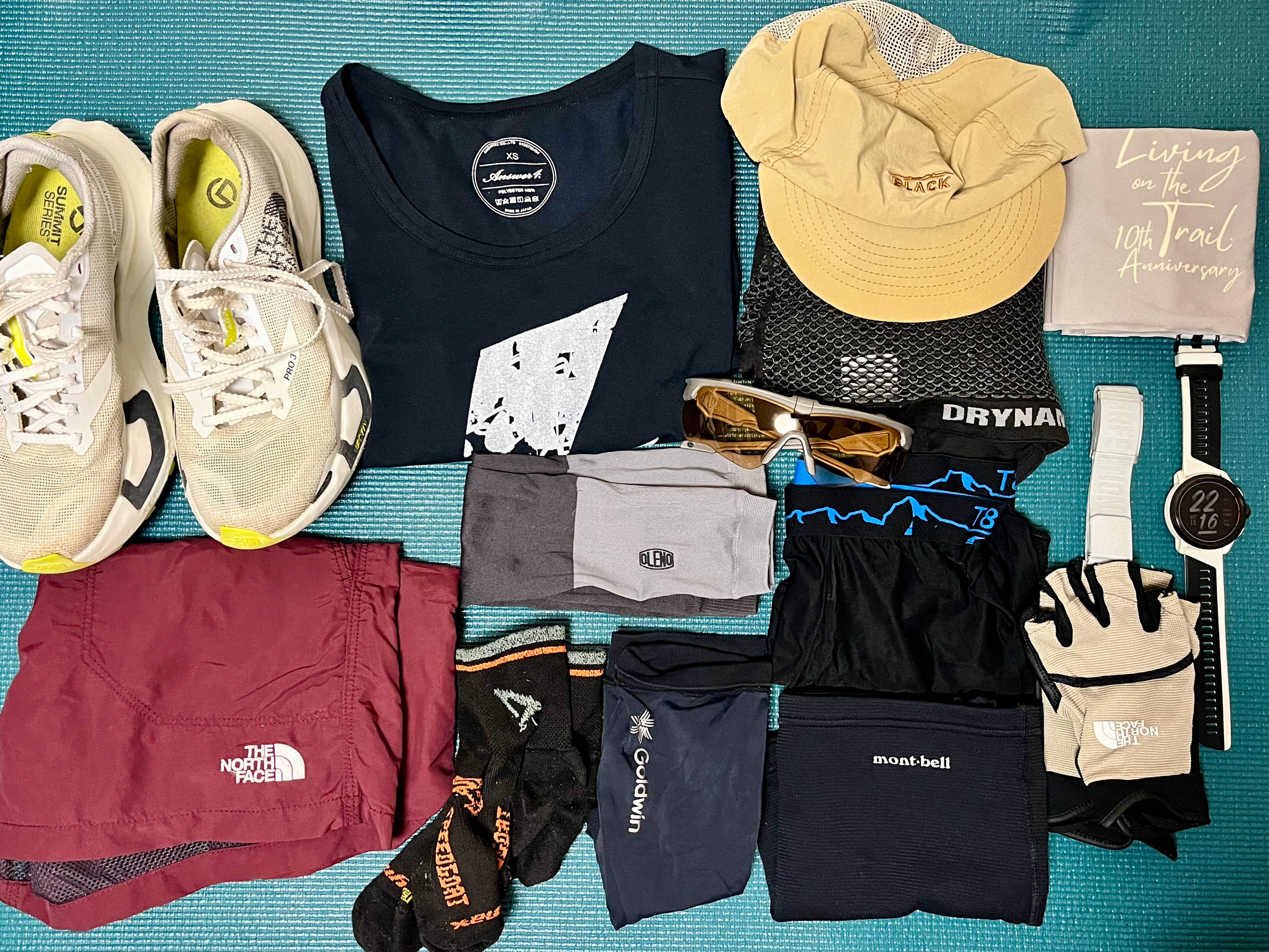 装備面では、必携品一式(ライト、レインウェア、防寒具、ファーストエイド、携行食、マイカップ、現金など)をもれなく用意。シューズは、ロングレースでは信頼性の高い相棒「The North Face Vectiv Pro 3」を選択した。コロコロ変わる天気予報に、何を着るべきか決められずかなり余分にウェアを持参、直前まで悩んだ。スタート前には「GONTEX」のテーピングを施し、長時間の負荷に備えた。