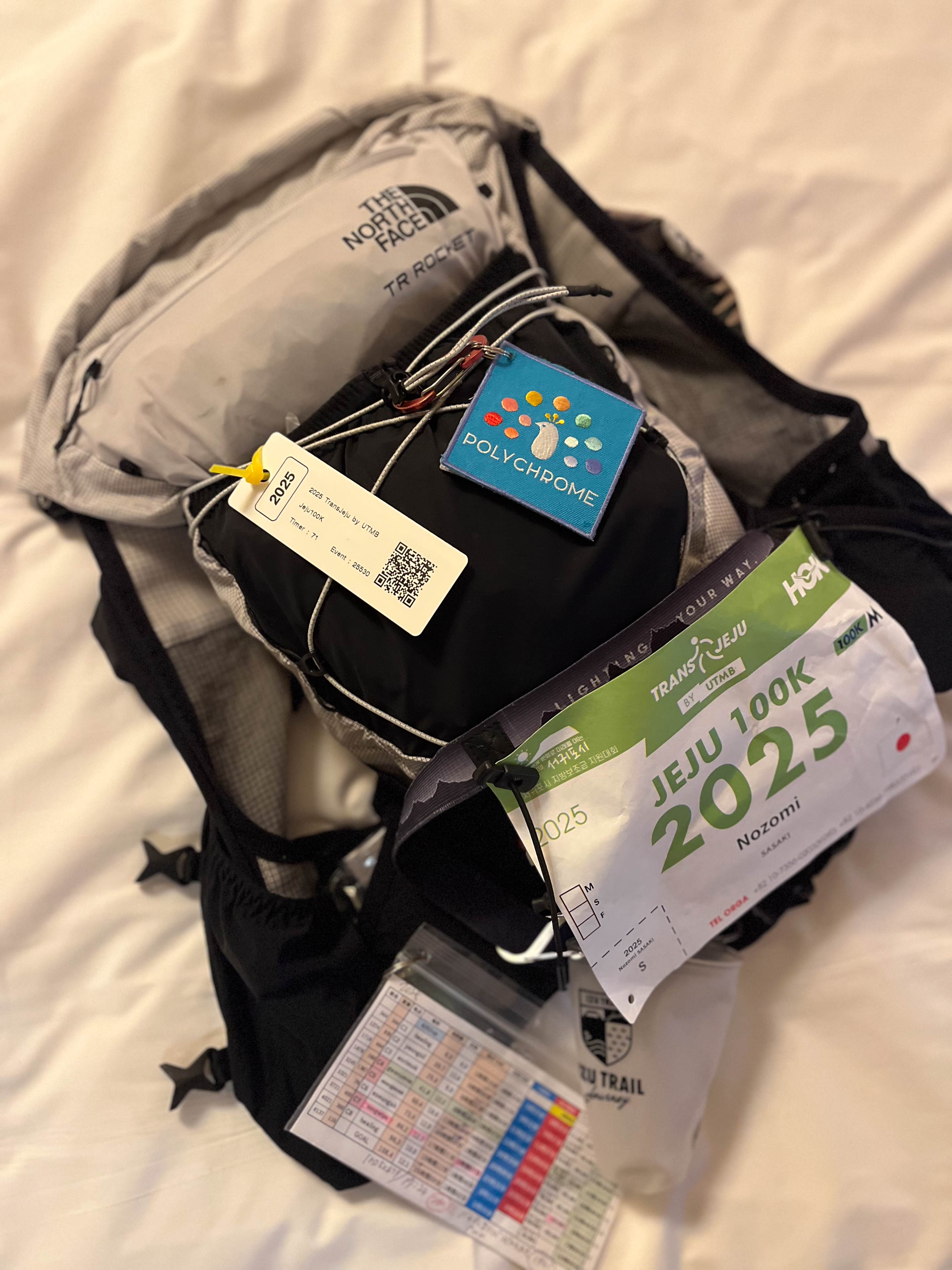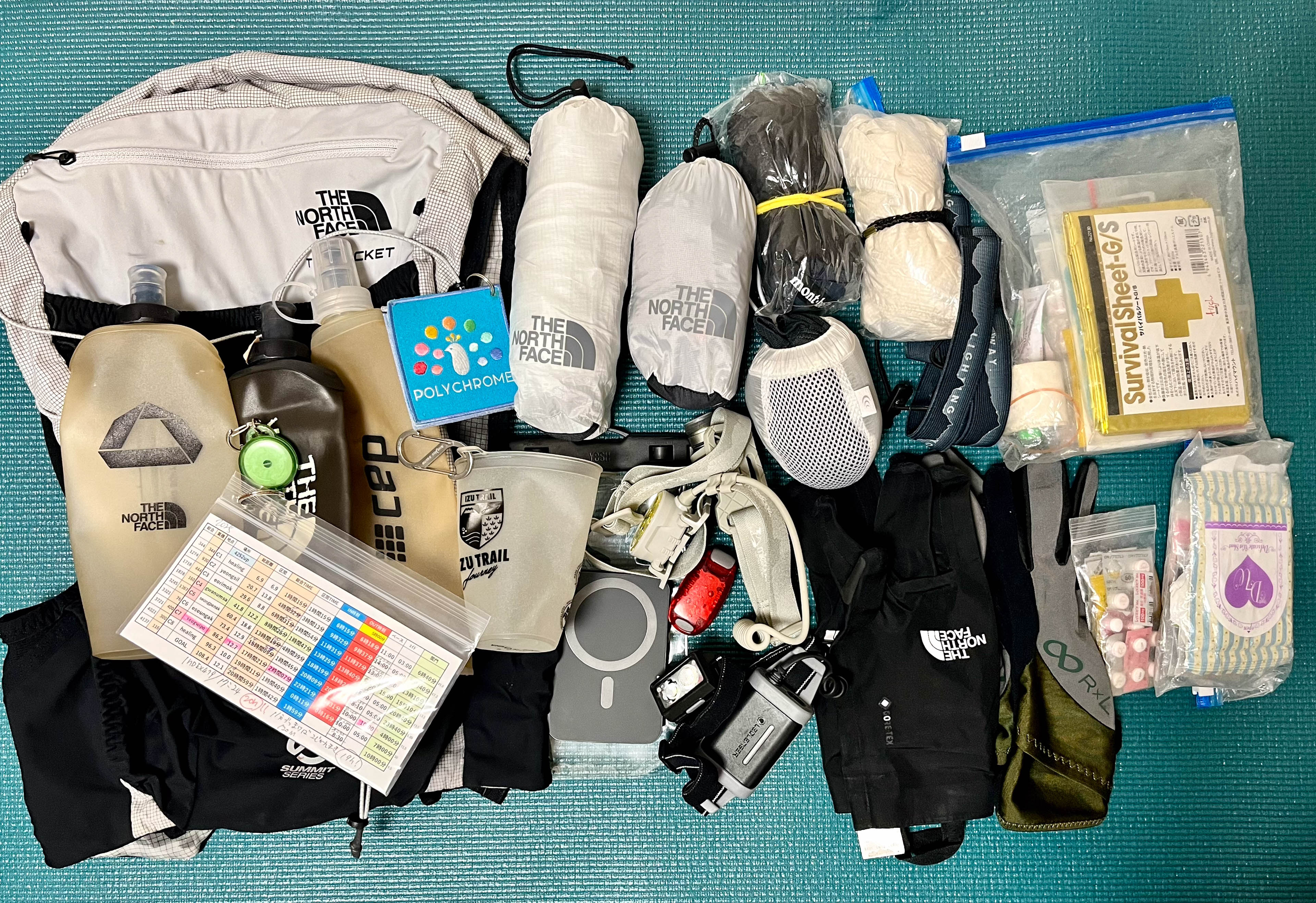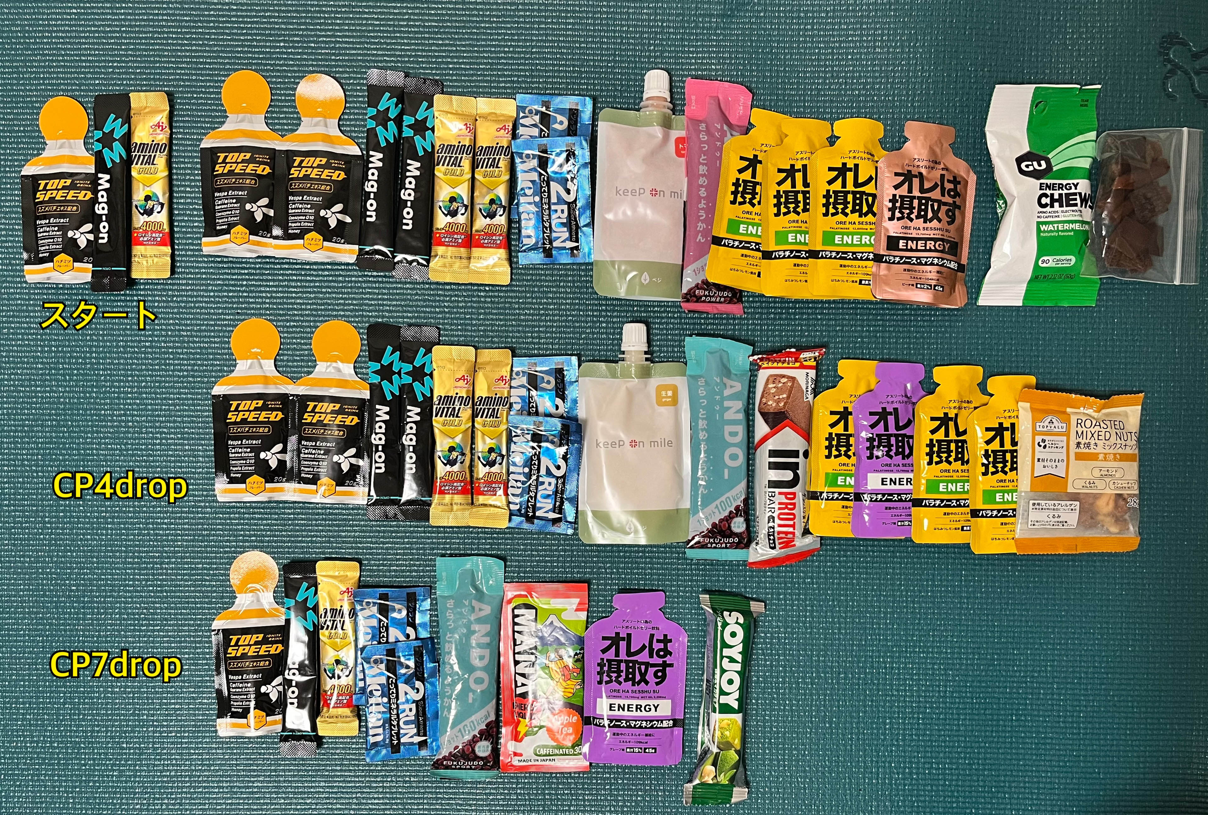 補給計画も綿密に立てた。エイド食は当てにしないでも走れる量の行動食を準備した。ドロップバッグは公式にはCP(チェックポイント)4(42km)のみ使用可だが、ルクタスのツアーサポートがCP4とCP7(86km)に入るため、オフィシャルのバッグは使わず、それぞれに補給食を小分けにして預けた。着替え類は天気予報とにらめっこし、レース後半のCP7に予備で預けることにした。