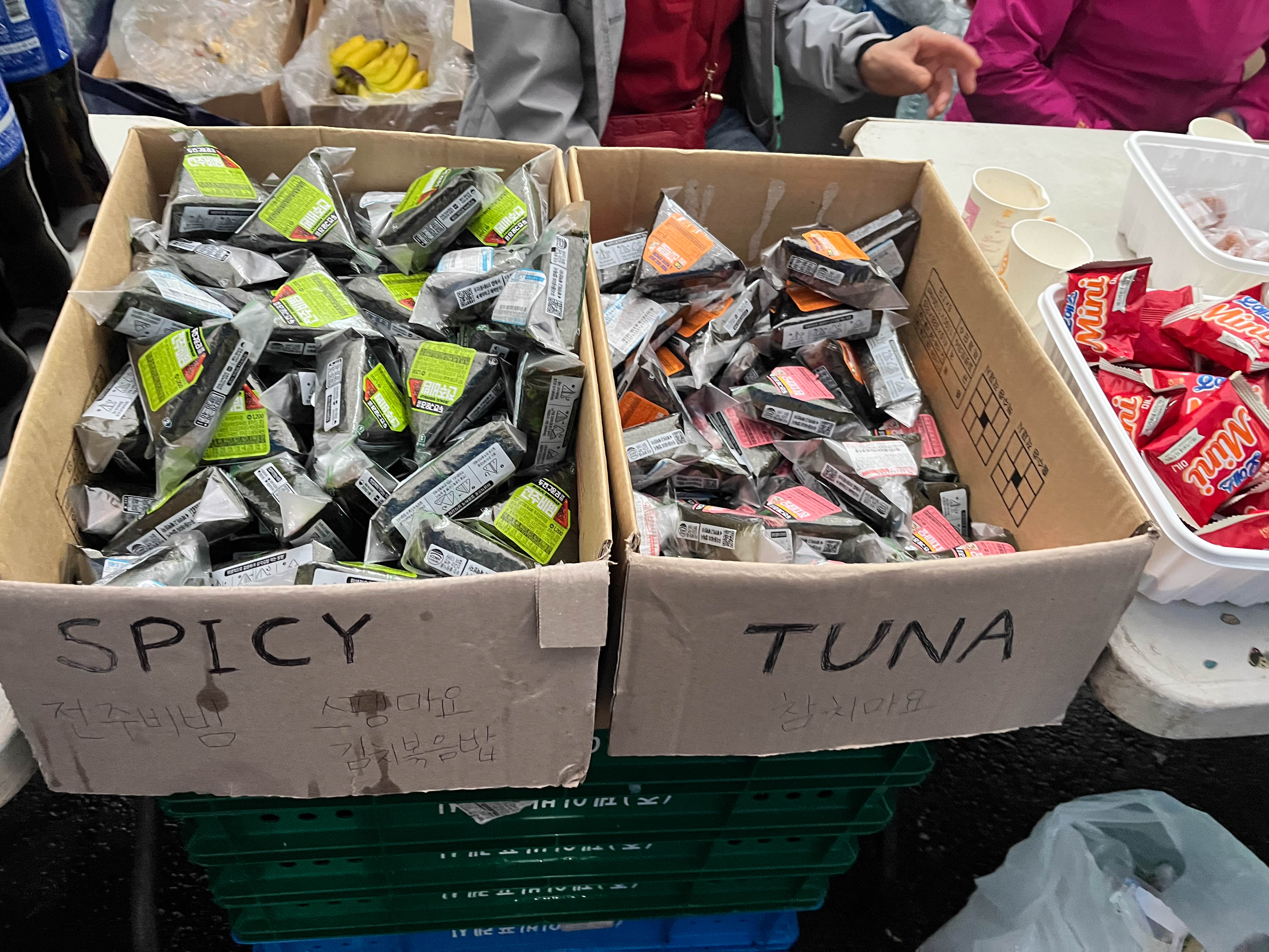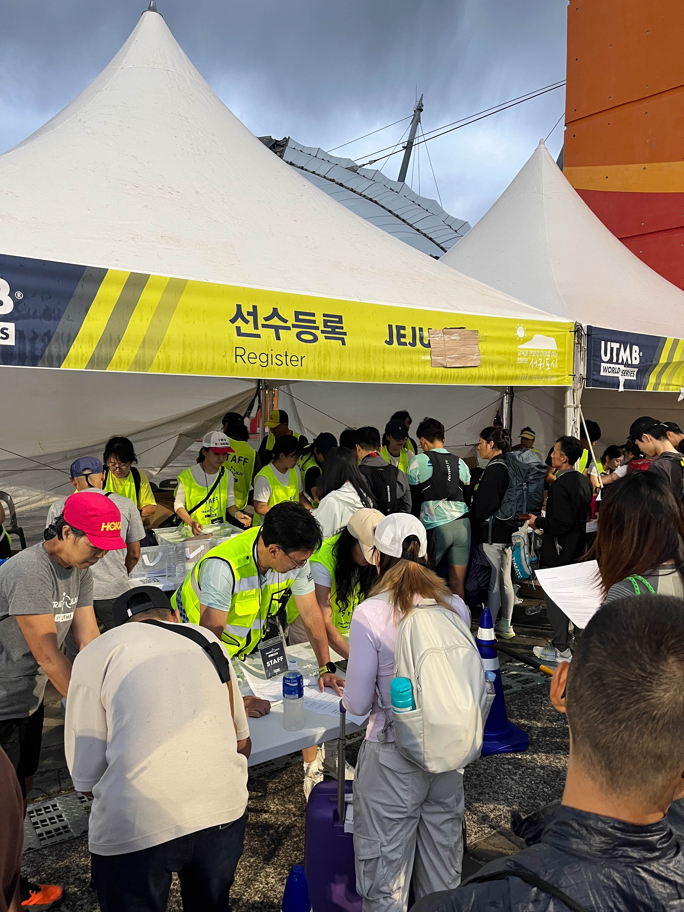 正午過ぎ、再び漢拏山に登る足がかりとして、最大規模のエイドであるCP4(42km地点)に到着した。ここでは抜き打ちの必携品チェックがあり、ヘッドライト、レインジャケット、サバイバルブランケット、スマートフォンの提示が求められた。数分のロスでクリアし、すぐ補給に入る。公式エイドはスルーして、テントの中にあるルクタスエイドへ。温かい素麺2杯、梅干しは10個くらい補給した。塩分と温かいものをしっかり摂取して体力が回復し再スタート。