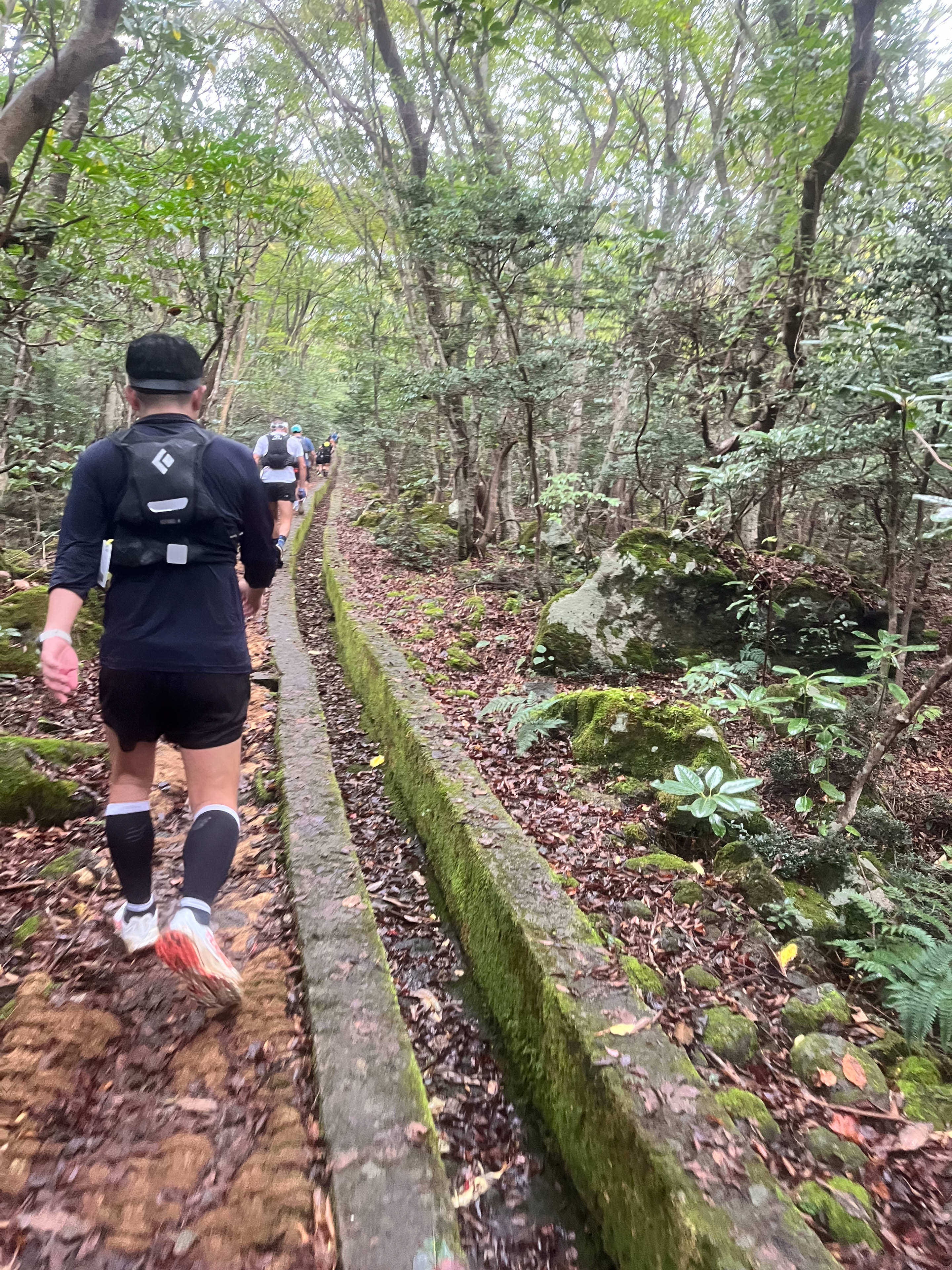 序盤は国立公園内の整備されたトレイルが続き、走りやすい。しかしわずか1時間で左脚の内転筋に痙攣の兆しが現れたため、早くも攣り対策に追われる。14km付近から小雨が降り出し、標高もまだたいして上げていないのに気温がみるみる低下。とともに、足が重く思ったように進めない。腹巻きとアームカバーを装着し、足首まで暑くて下げていたカーフスリーブも引き上げて保温に努めた。