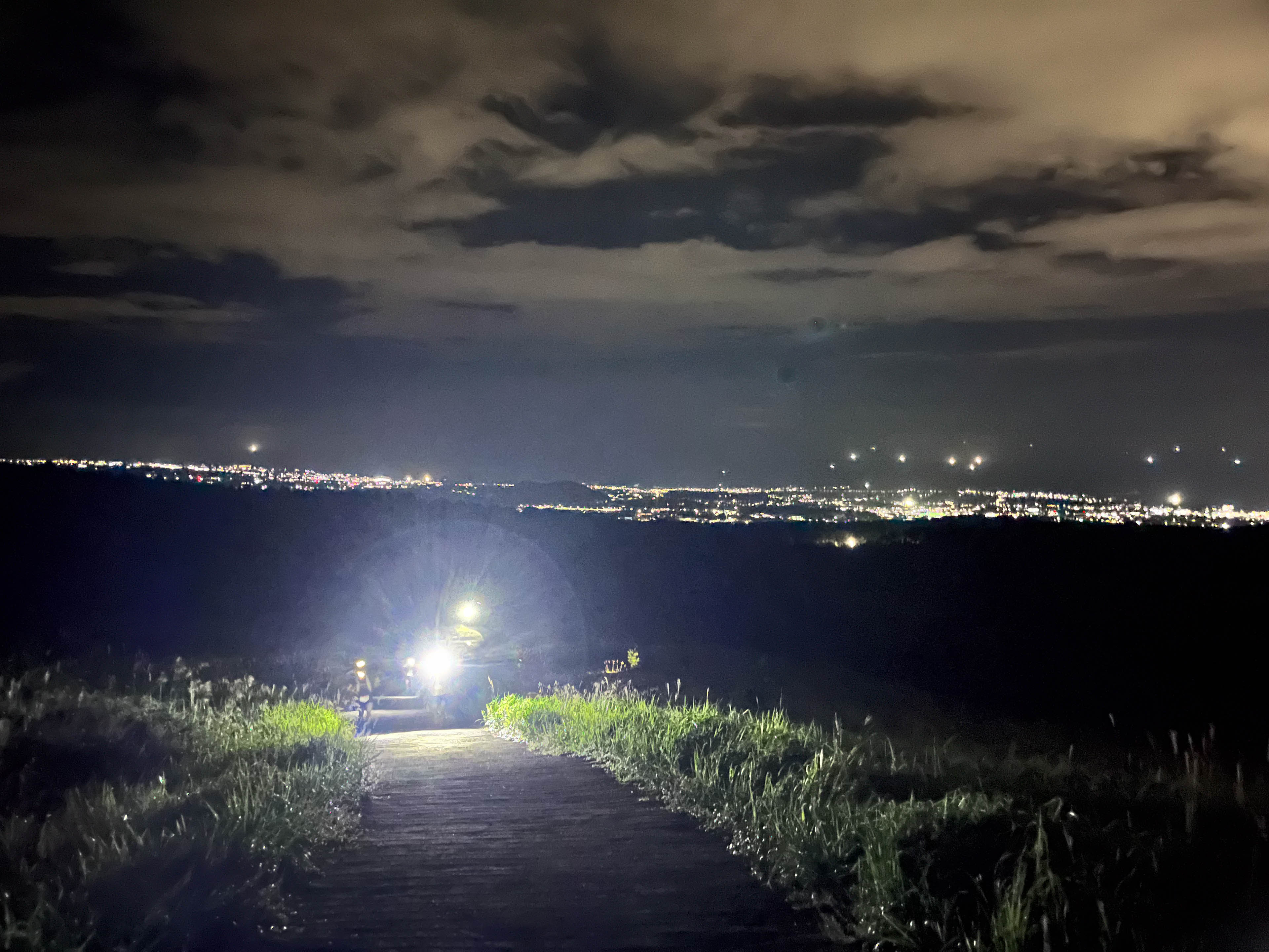 残り約14km、最後の小さな峠を越えればフィニッシュは目前だ。漆黒の山並み越しに麓の街灯りが瞬いている。最後のエイド、CP8(96km)に目標の1時間21分遅れで到着。胃が疲れて固形物は摂る気になれない。水分補給だけして通過した。