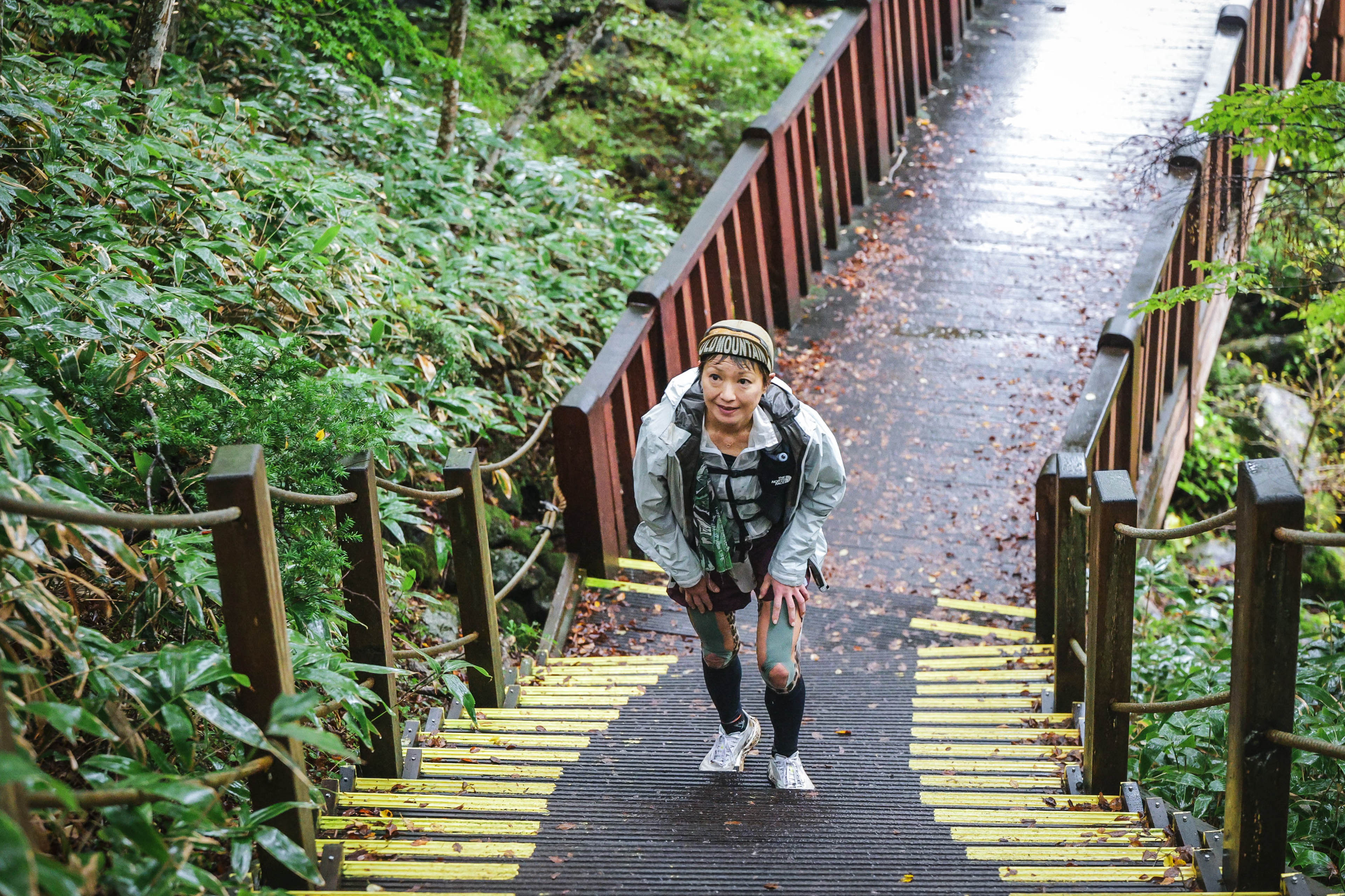 次のCP5までの距離は18.6km、獲得標高が1,367mという、このレース最大の難関区間だ。樹林帯を貫く登山道は、非常によく整備されていて、ほとんどが階段だが、急斜面を黙々と登り続けるのは辛く、ペースダウンする選手たちも多かった。私自身は、塩分をしっかり取れたのがよかったのか、やっと調子が戻ってきた。森林限界を越える頃ようやく雨が上がった。