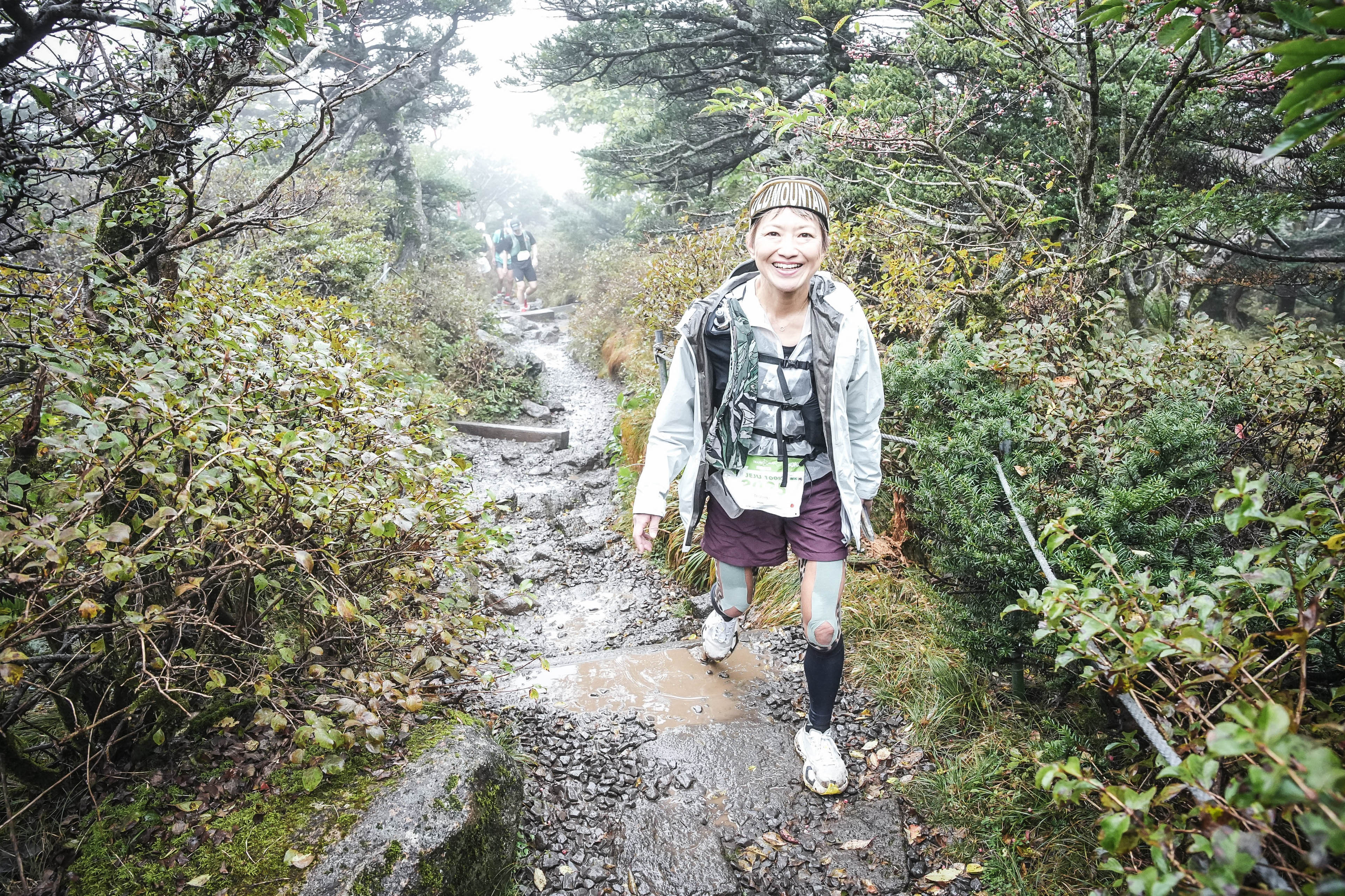 今回の100kmレースでは、この漢拏山登頂を含むコースを走り抜ける。10月の済州島の気候は日本の九州に近いが、山間部は天候が変わりやすく、風も強いため、雨対策と寒さ対策がカギとなった。さらに、この大会ではトレッキングポールの使用が禁止されているので、脚力だけで長い登り下りに挑まねばならない。