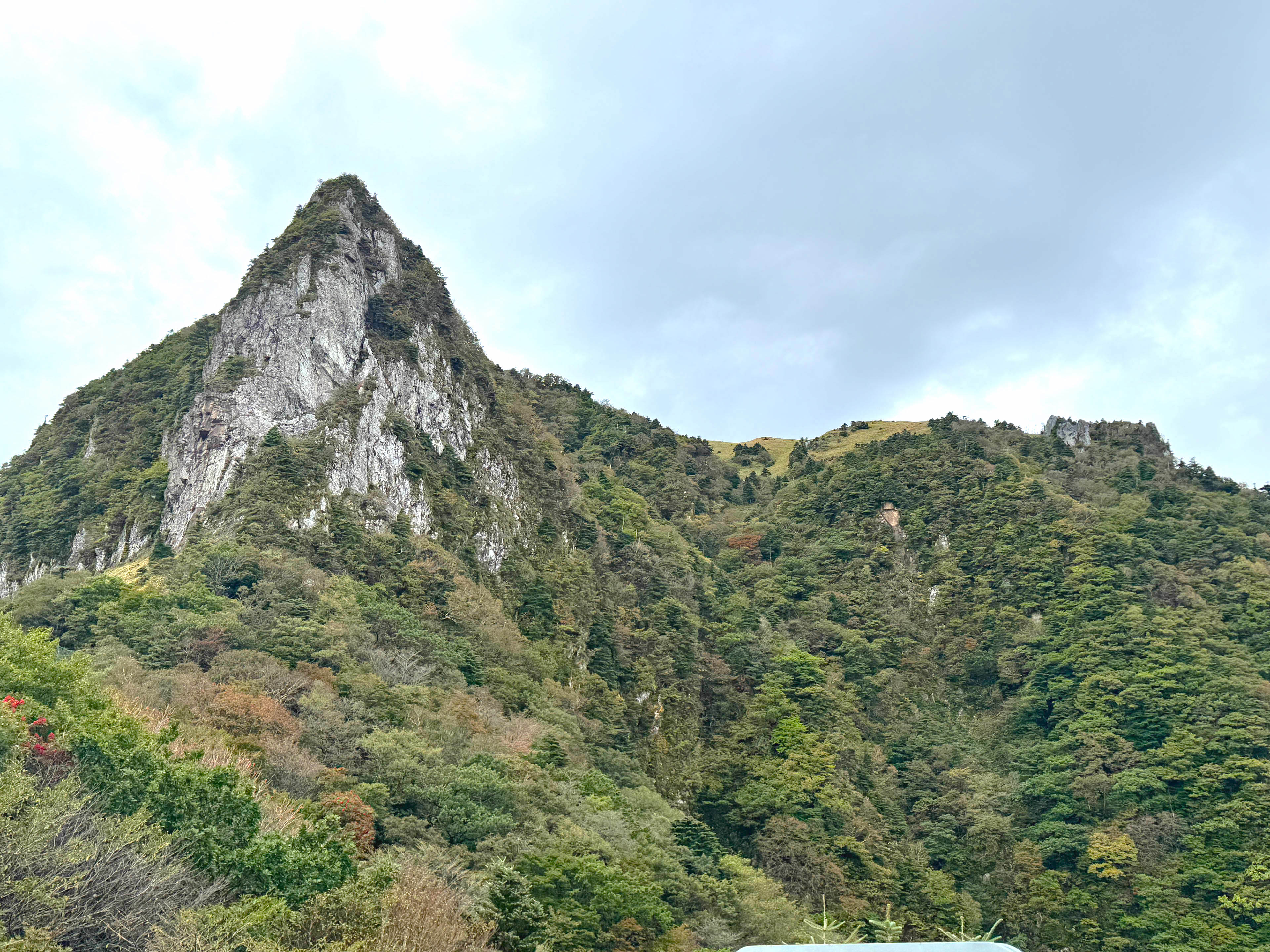 向かった霊室コースは、晴れていたら絶景が見られるはずの、天国に繋がると言われる長い階段。しかしこの日はしっとり濡れる霧雨が降り続き展望もなく、黙々と標高を稼ぐ。山頂近くまで登って、一旦麓まで下る。