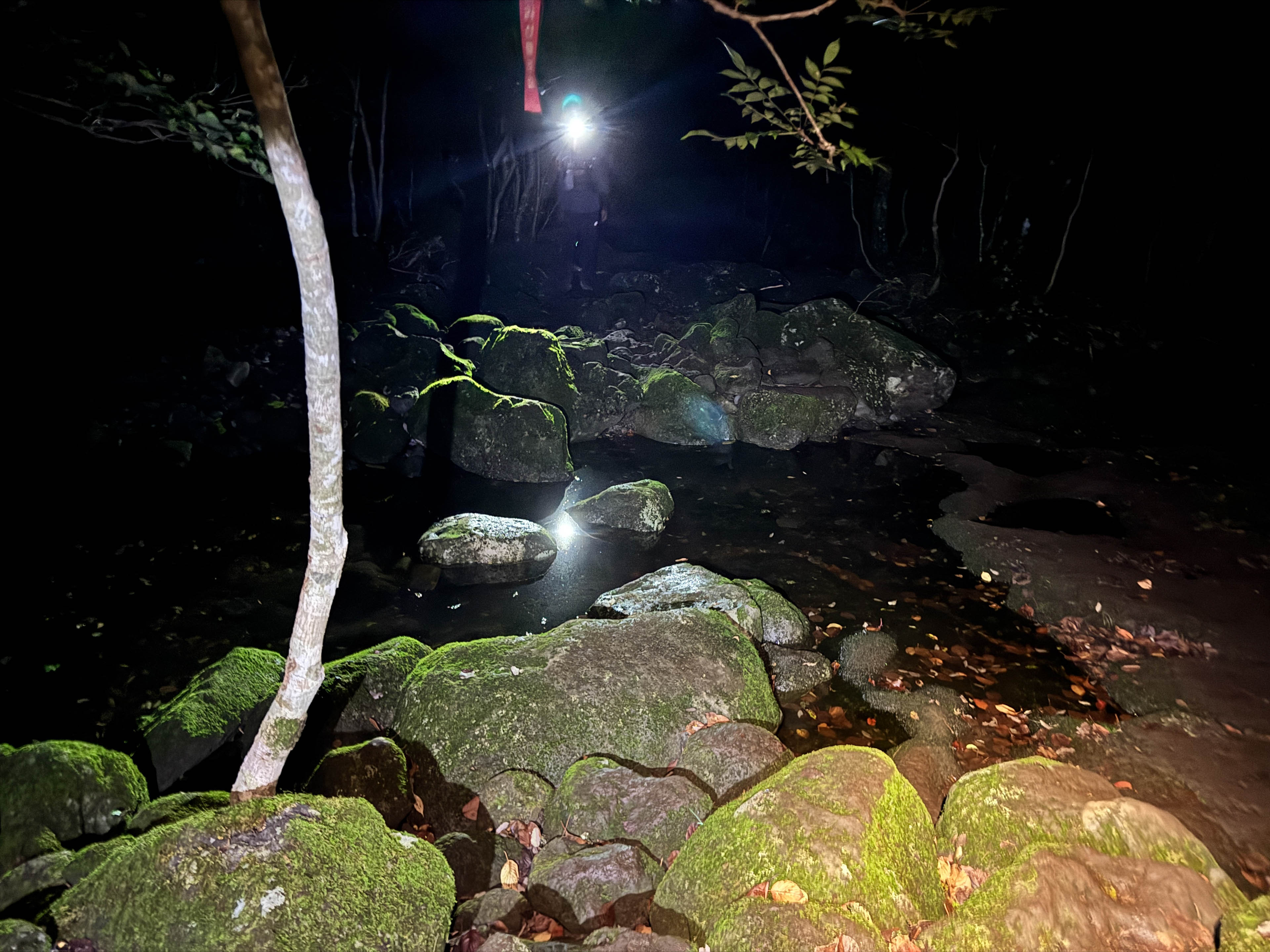 ここからはまた雰囲気がガラリと変わる。完全な闇の中、泥濘に足を取られながら前進したり、苔のついた滑るゴロゴロ岩のある沢を渡渉したり、難所続きに心身ともに堪える。スタートから16時間くらい経って、ついに眠気がでてきた。足全体がぼちぼち痛い。残り5時間しっかり走れるように、鎮痛剤とカフェイン錠を飲む。