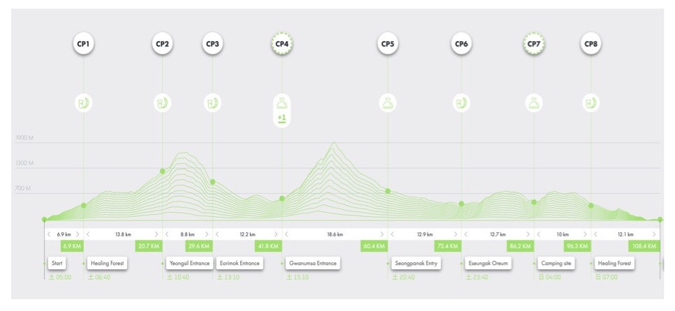 CP2・霊室(ヨンシル、20.7km)には3時間34分で到着。予想より速いペースではあるが、体調は良くない。防寒が足りなかったようで、立ち止まると震えるほど寒い。急いでシャインマスカットと大福を食べて水を補給し、エイドを後にする。走り出しても震えは止まらず、ソフトシェルを着込みレインウェアを重ね、絞れるほど濡れたグローブを外し防風グローブに替えた。15分ほど走るとようやく寒さを感じなくなって一安心した。
