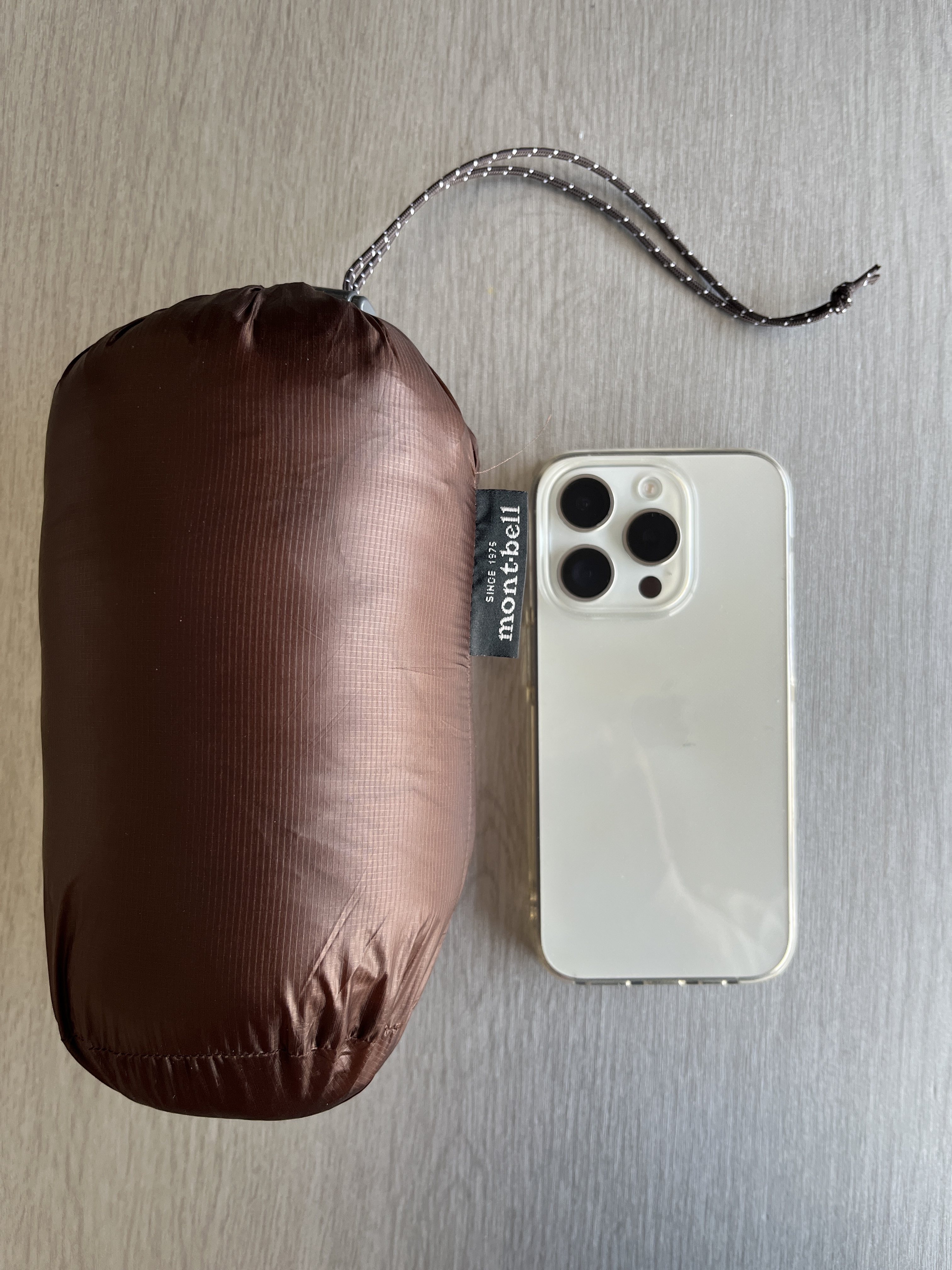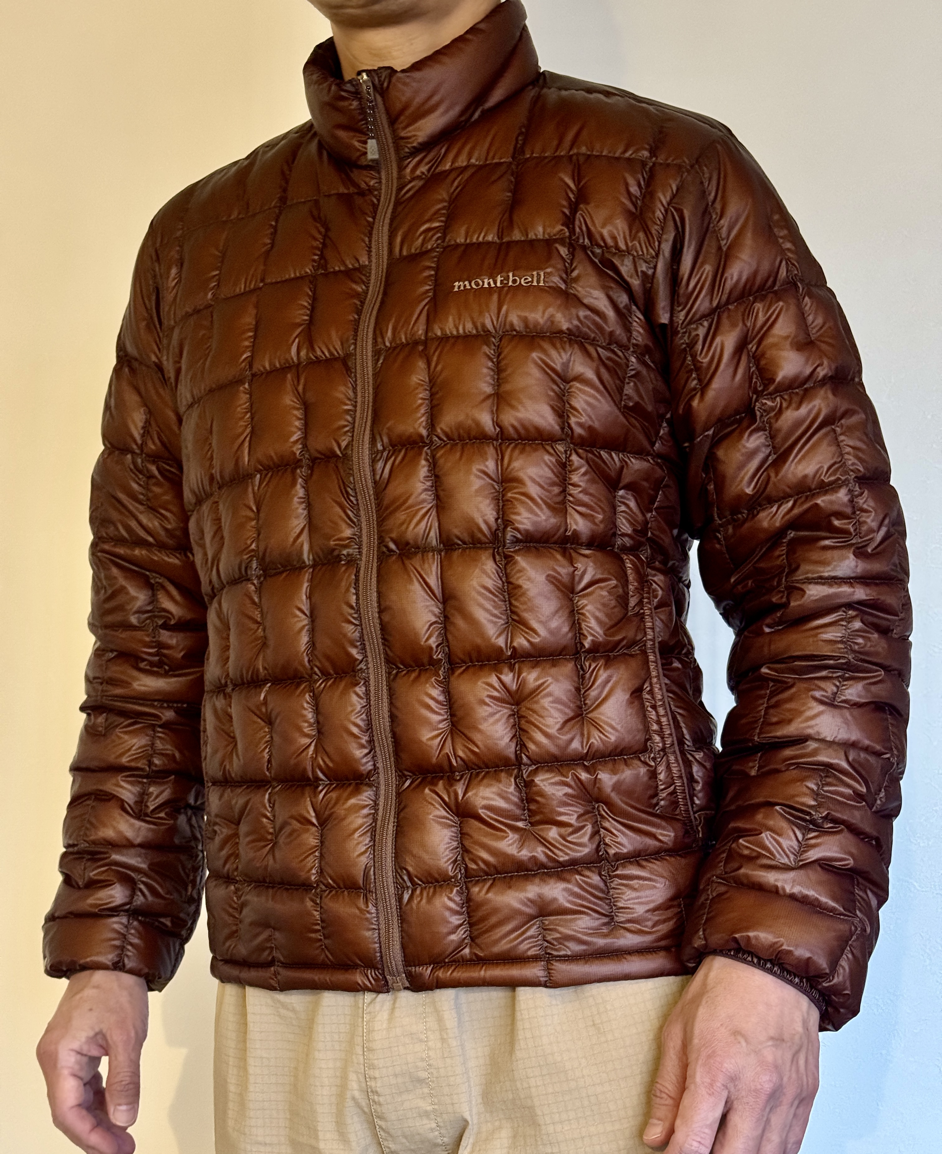 ダウンジャケットならすでにいくつも持っているのだが、多くの製品は嵩張るし、重い。ぼくが軽いダウンの重宝さに気づいたのは、同じモンベルの「EXライトダウンベスト」をかれこれ10年近く前に入手したからだ。ホットドッグがちょっと太ったくらいのサイズで、折りたたんで袋に詰めればどこへでも持っていける。この手軽さを袖付きでも味わうために、軽さと薄さに特化したダウンジャケットをいろいろ探した結果、同じモンベルに落ち着いた。