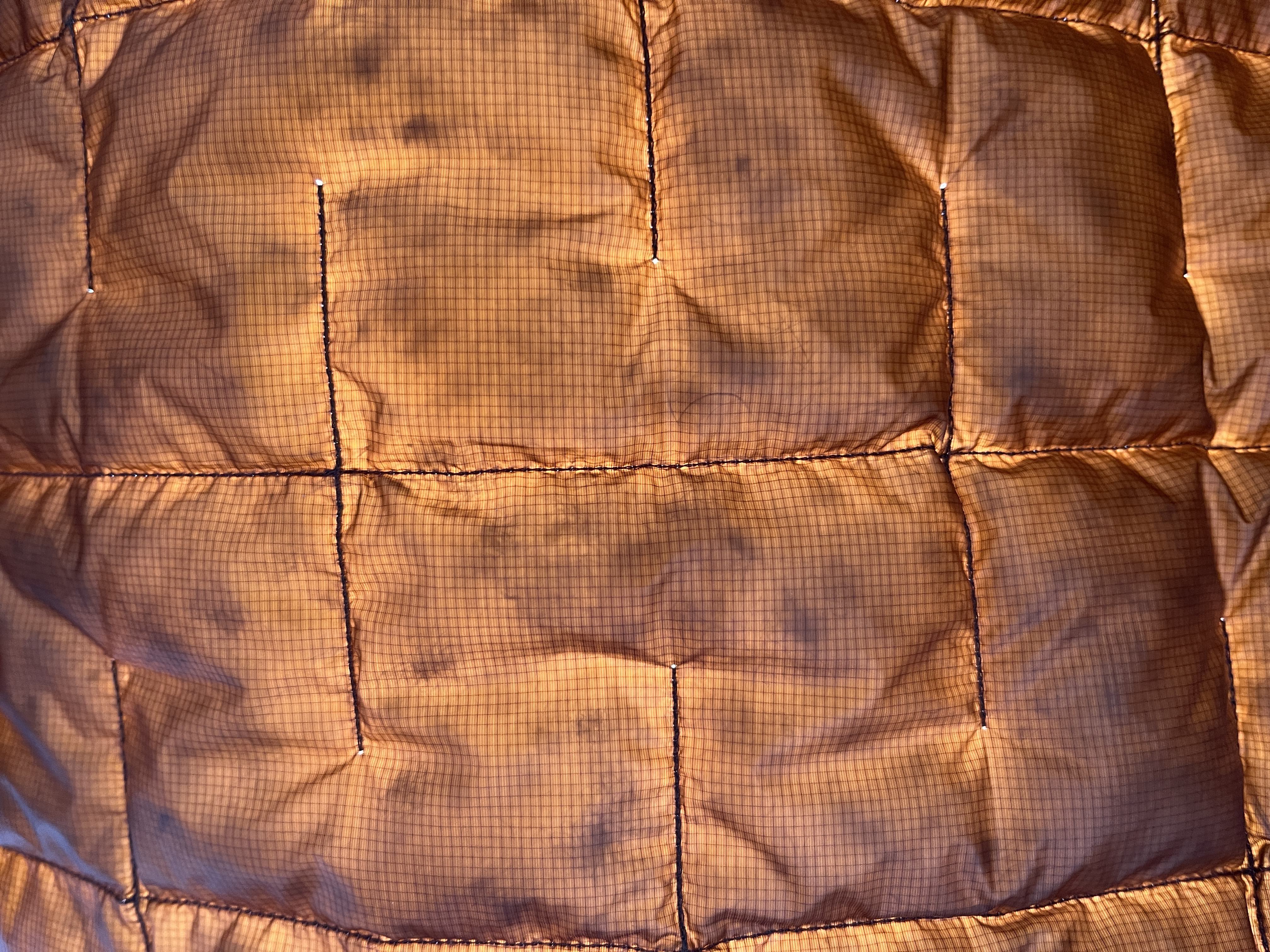 さらに生地を透かしてみると、その徹底ぶりが理解できる。デザイン性への配慮もあるのだろうが(それがこの製品の魅力にもなっている)、完全に碁盤の目のように上下左右にステッチが入っているのではなく、羽毛の通り道がS字状に配置され、結果ステッチの長さと重さを低減している。