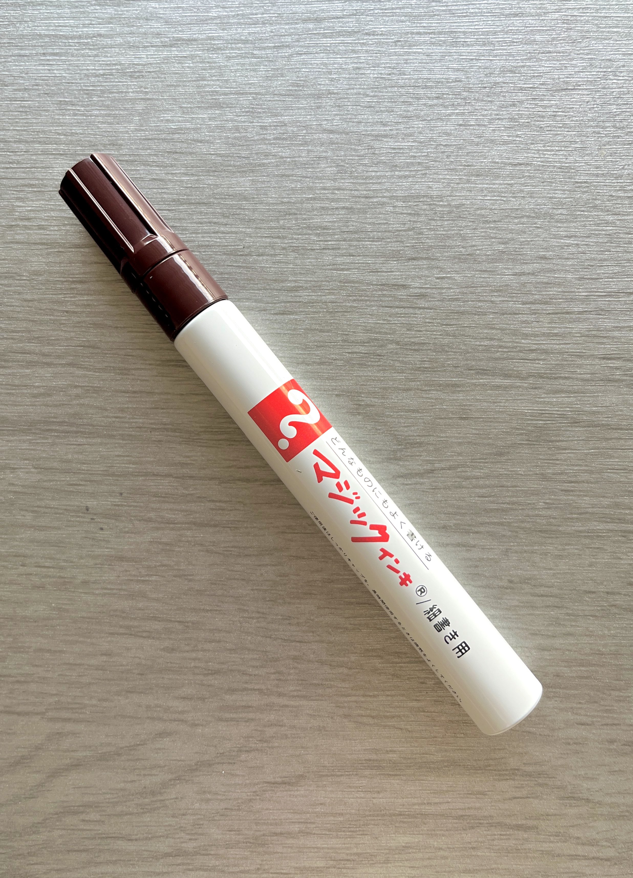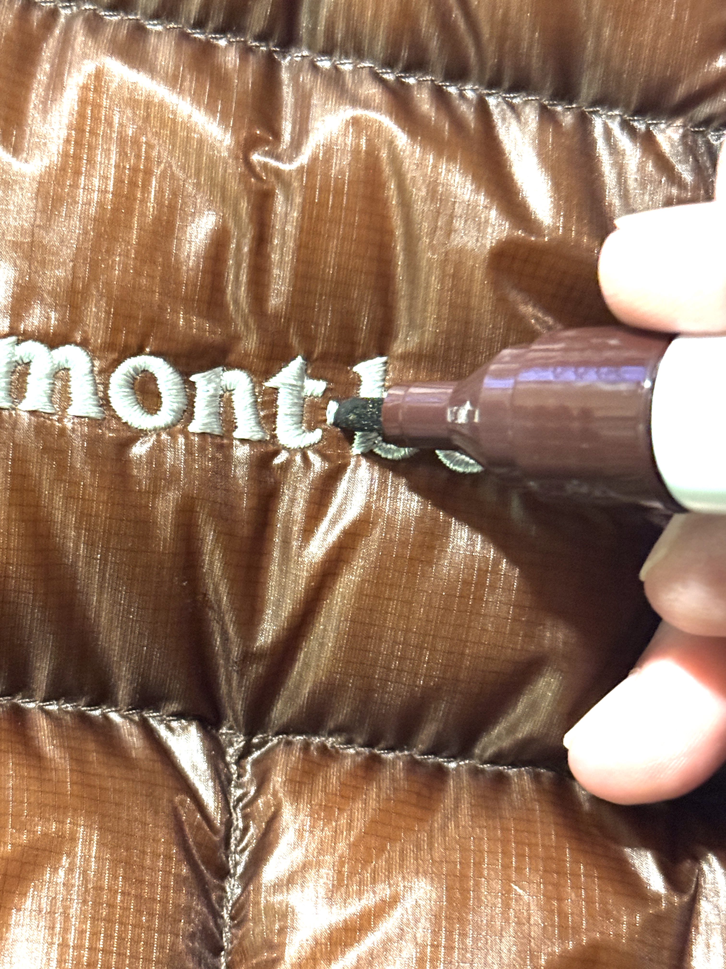 実は黒いダウンベストにも白いロゴ刺繍があって同じ事をしたのだが、ぼくはマジックインキの「焦げ茶」を買ってきて、ロゴ部分にチョンチョンとインクを刺して目立たないようにしてしまった。