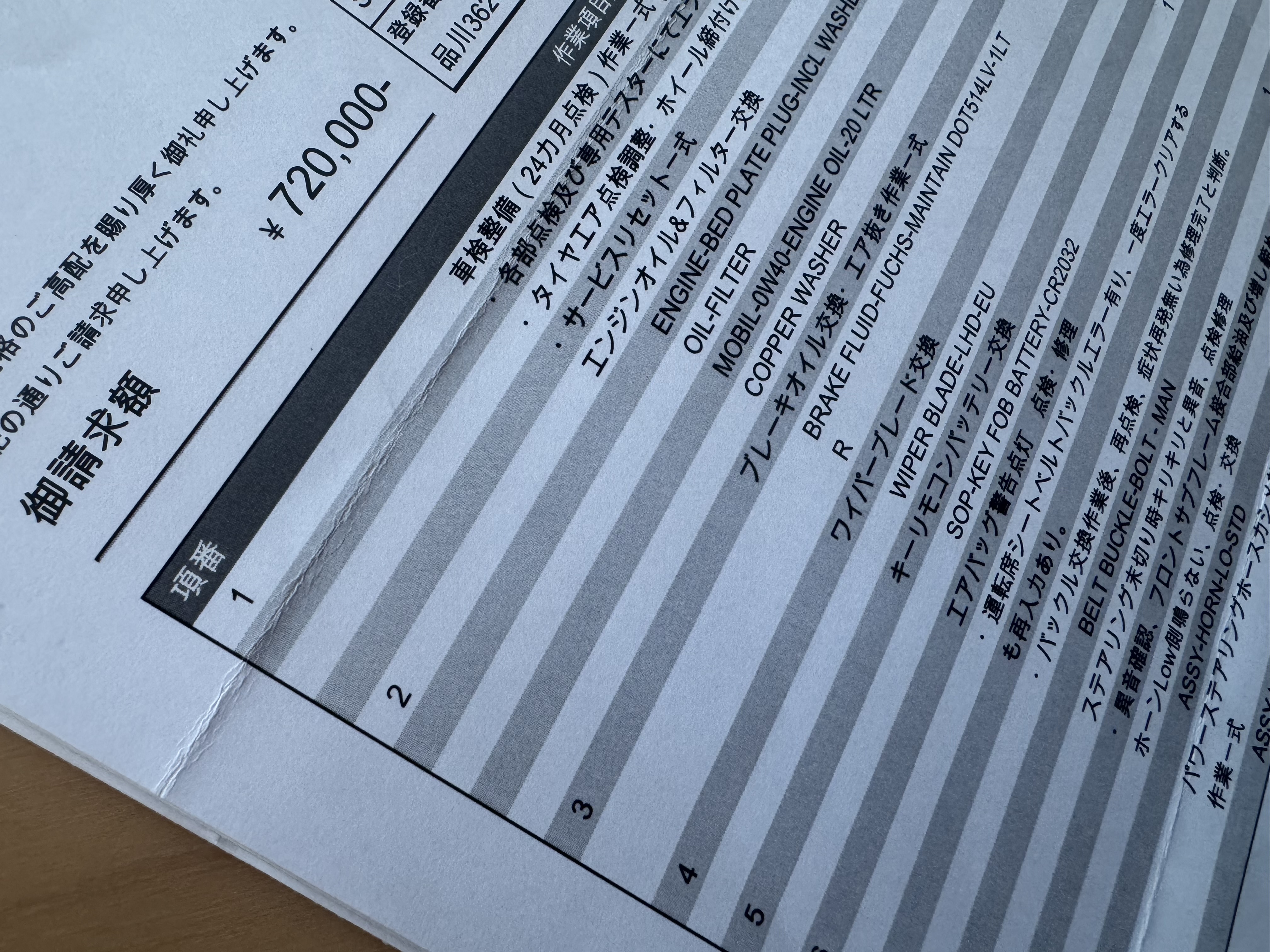検討したところ、ステアリングコラム不具合はすぐに手をつけるか微妙なレベルであるためカット、フロントサスペンションもまだ問題なさそうなので今回は見送ることにした。富裕層であればすぐに交換を選ぶだろうが私にはそこまでの余裕はない。これらを今回の対象から外し、通常の車検整備や消耗品交換に加えて「右ドライブシャフトからのオイル漏れ修理」「シートベルトバックル交換」などを依頼し、合計金額は税込で720,000円。結果的には前回車検よりも大きな金額となった。入庫期間はおよそ90日だった。